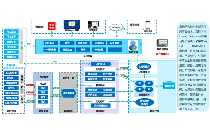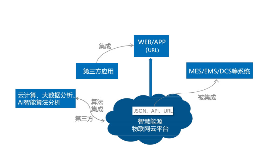 对智能设备运行数据进行采集、展示、存储及转发,提供标准数据接口及访问模式,可方便被集成到第三方应用系统中,如MES/EMS/DCS等用户企业业务系统。