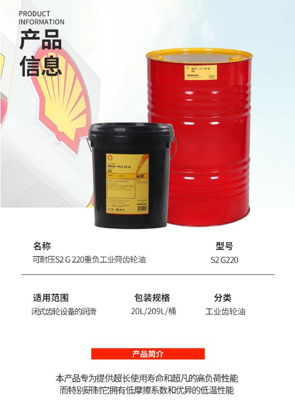 商品名称:壳牌220号齿轮油 OMALA可耐压S2 G 220工业齿轮油 20L/桶