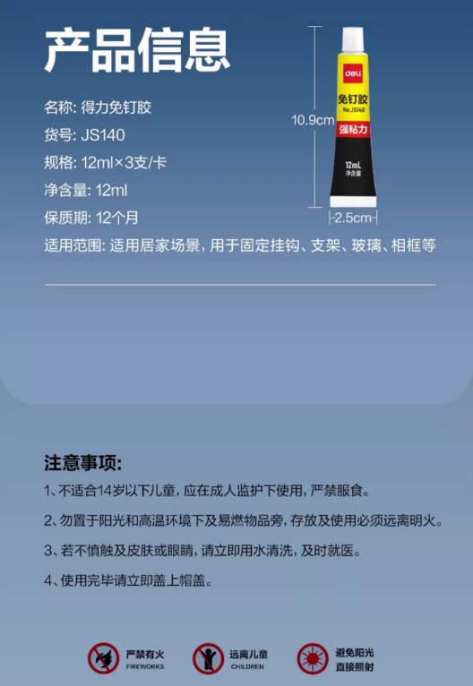 品牌:Deli/得力型号:得力新型强粘js140免钉胶-粘墙神器F上市时间:2024-04-19
