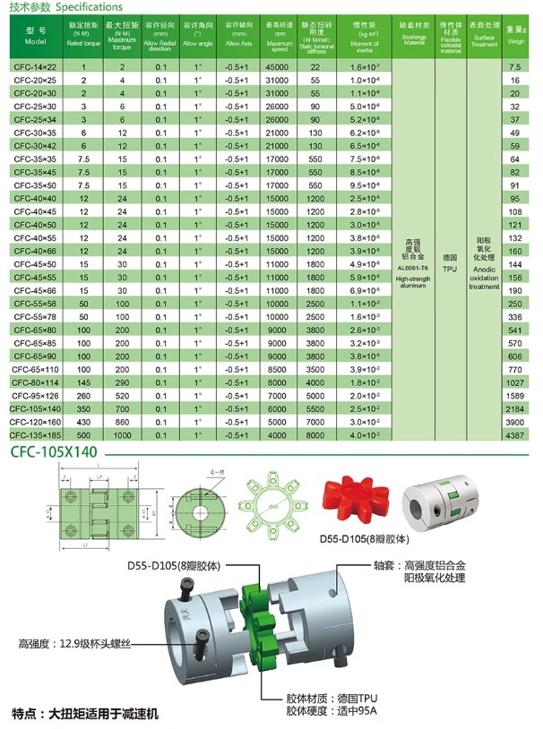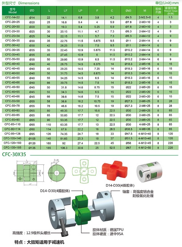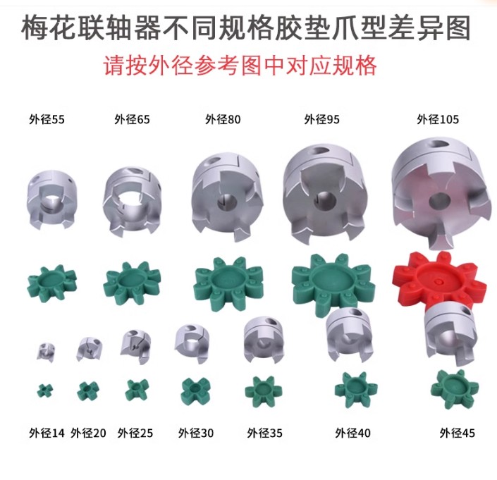 产品结构:梅花联轴器 主体材质:6061铝合金 胶块材质:德国进口聚氨酯